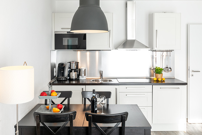 Komfortables 2-Zimmer-Appartement mit einem separaten Schlafzimmer mit Boxspringbett und Zugang zum Südbalkon und Blick Richtung Garten, einem Wohnzimmer mit einer Küchenzeile mit Geschirrspüler, Mikrowelle, ausklappbarem Schlafsofa, Zugang zum Südbalkon, Flur, Bad.